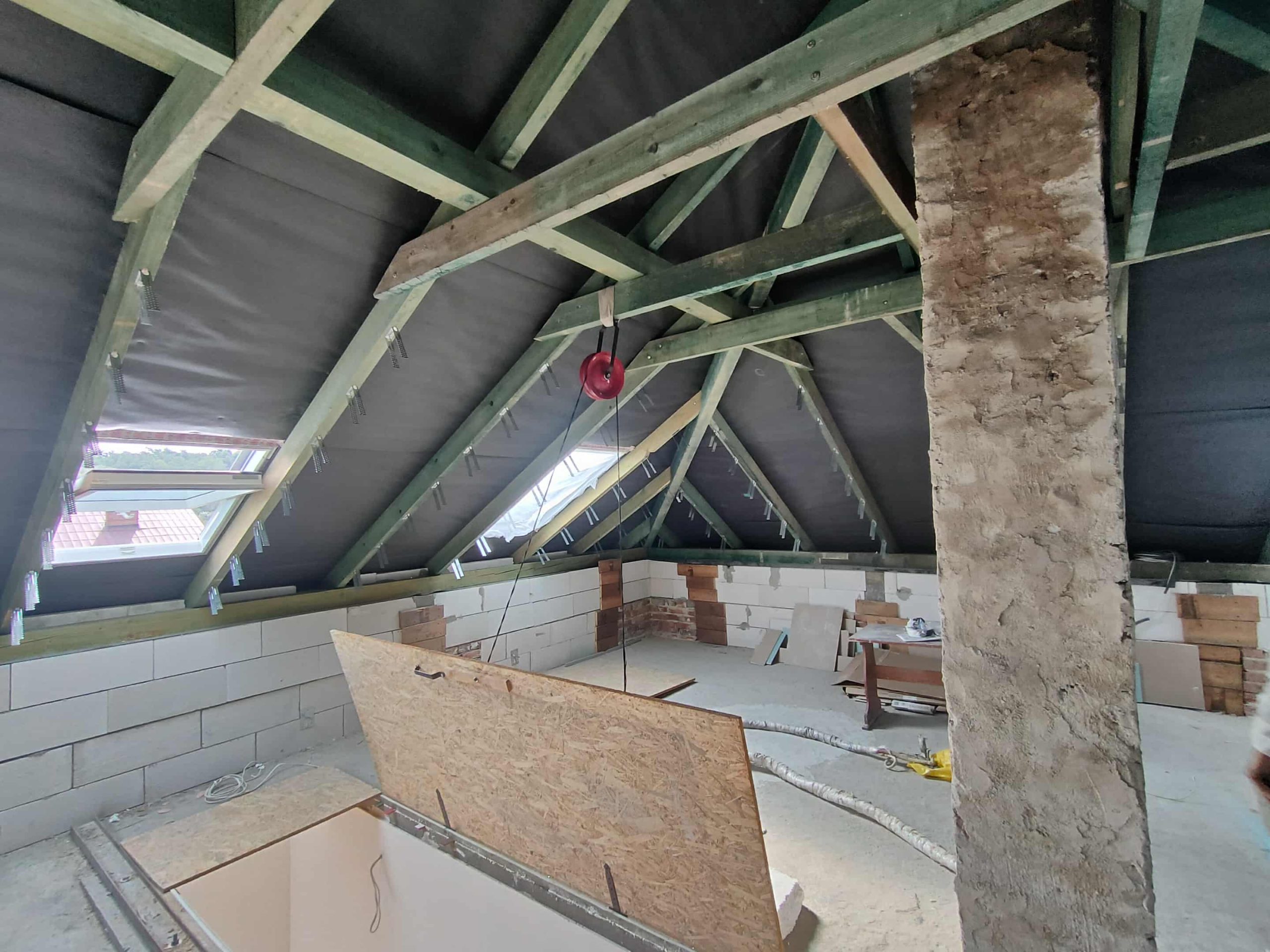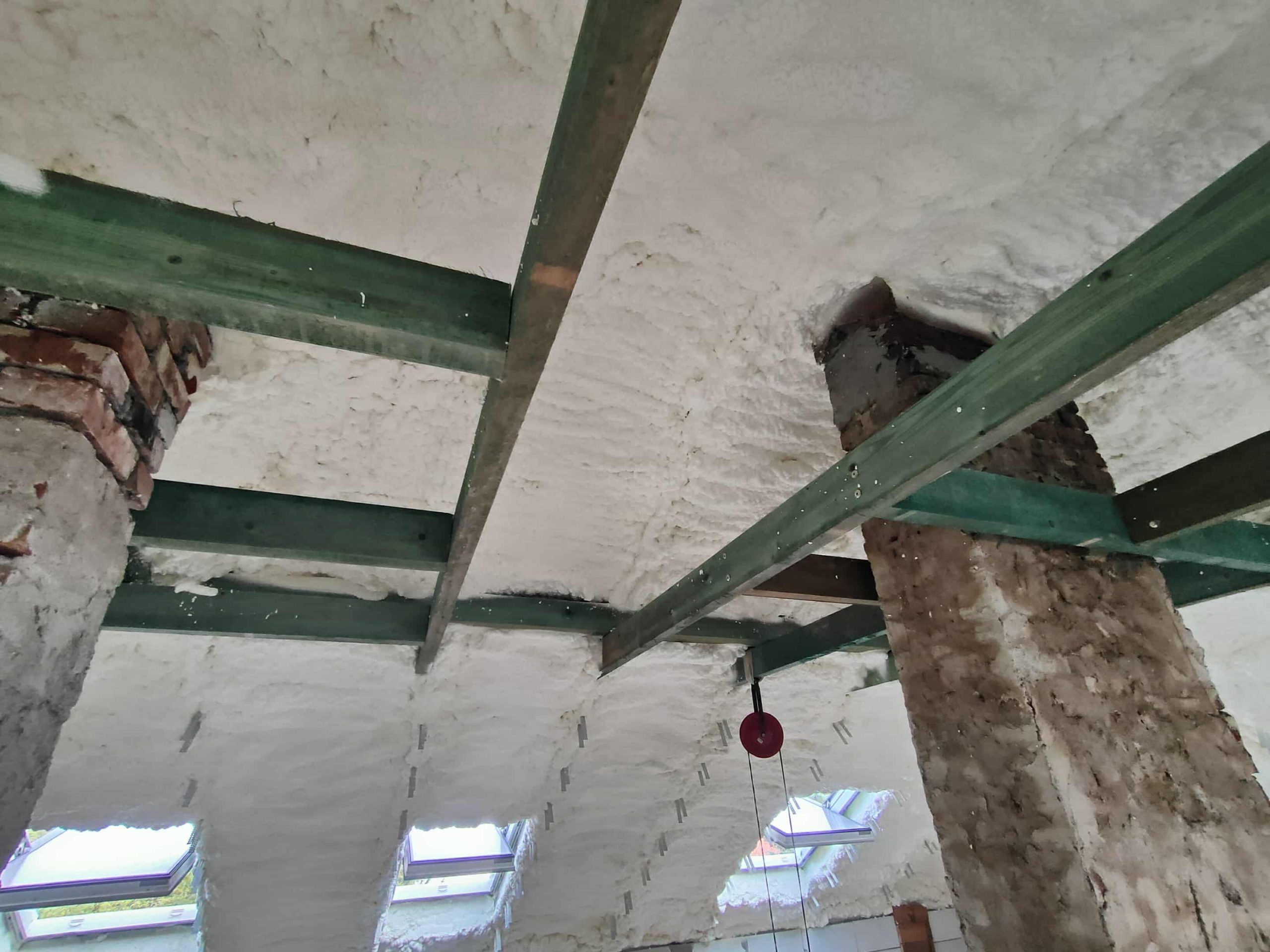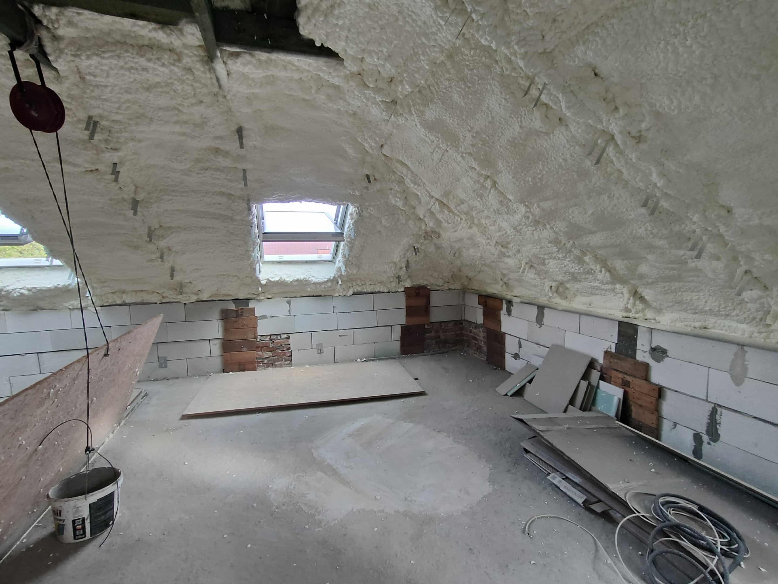 Realizacja w Pustynach wymagała dopasowania piany do nieregularnych kątów i elementów konstrukcyjnych, takich jak kominy, jętki, połączenia murów czy okna dachowe. Natrysk PUR pozwolił dokładnie pokryć całą powierzchnię połaci, wypełniając przestrzenie wokół krokwi i elementów nośnych. Piana utworzyła jednolitą, szczelną warstwę izolacyjną, która jednocześnie zabezpiecza poddasze przed przewiewami i utratą energii. Dzięki temu poddasze zostało przygotowane zarówno do użytkowania, jak i do dalszych etapów prac wykończeniowych.