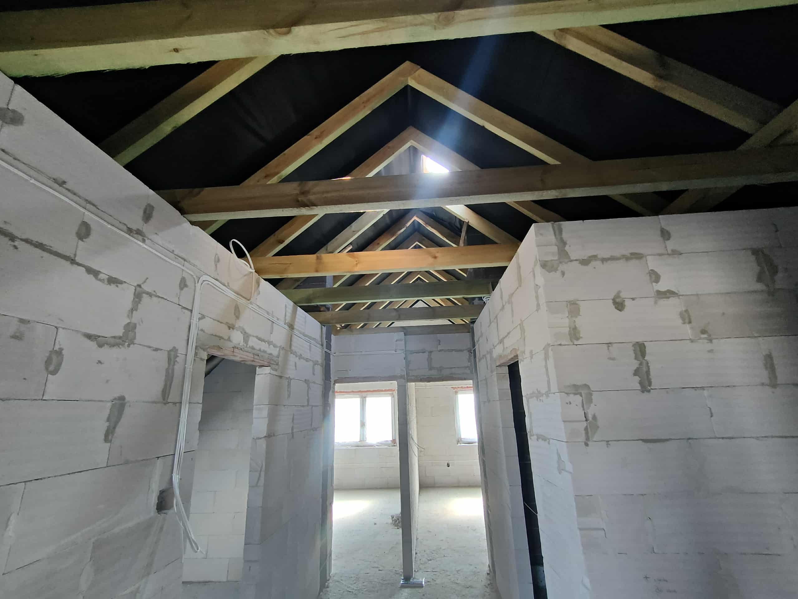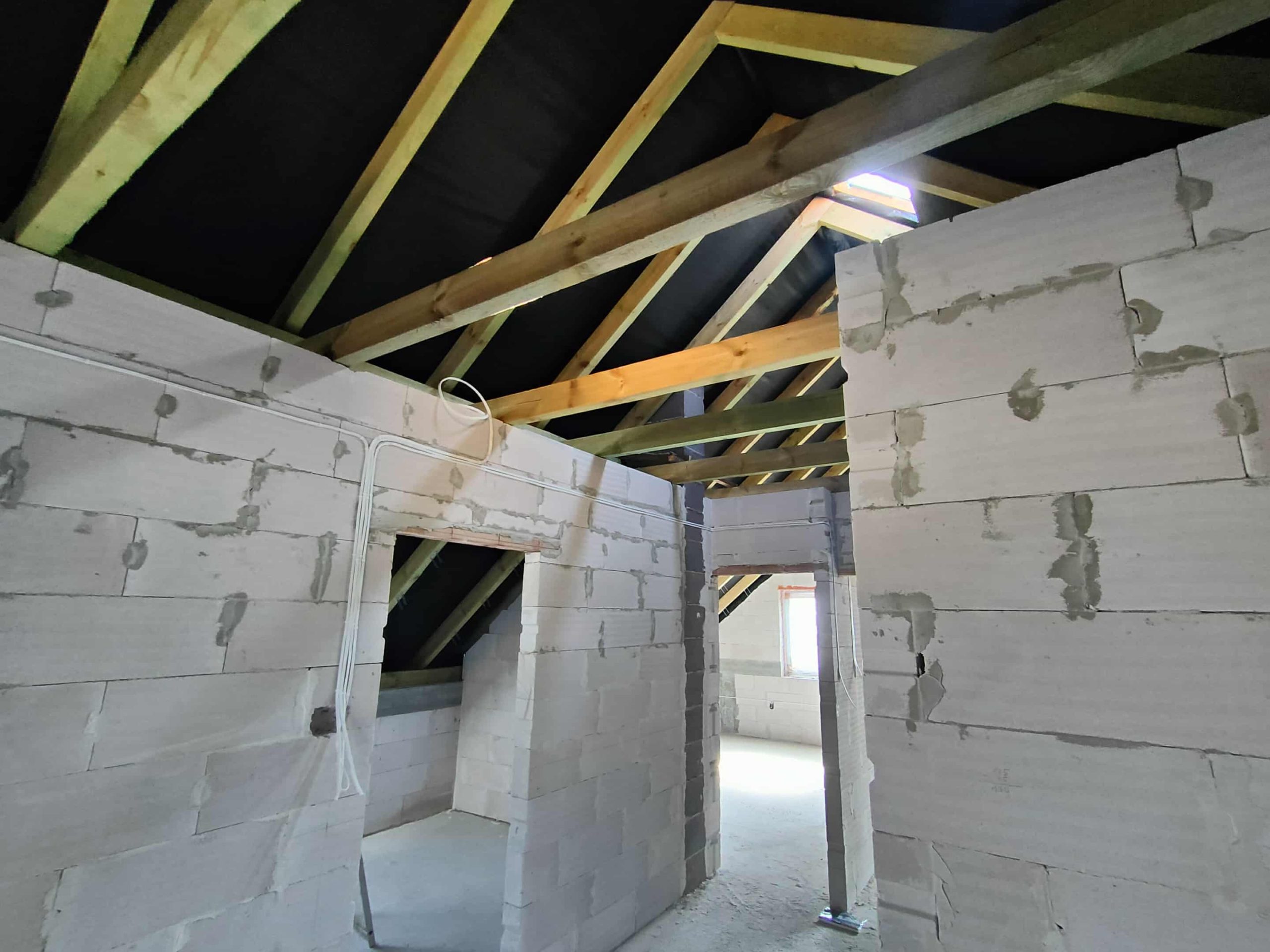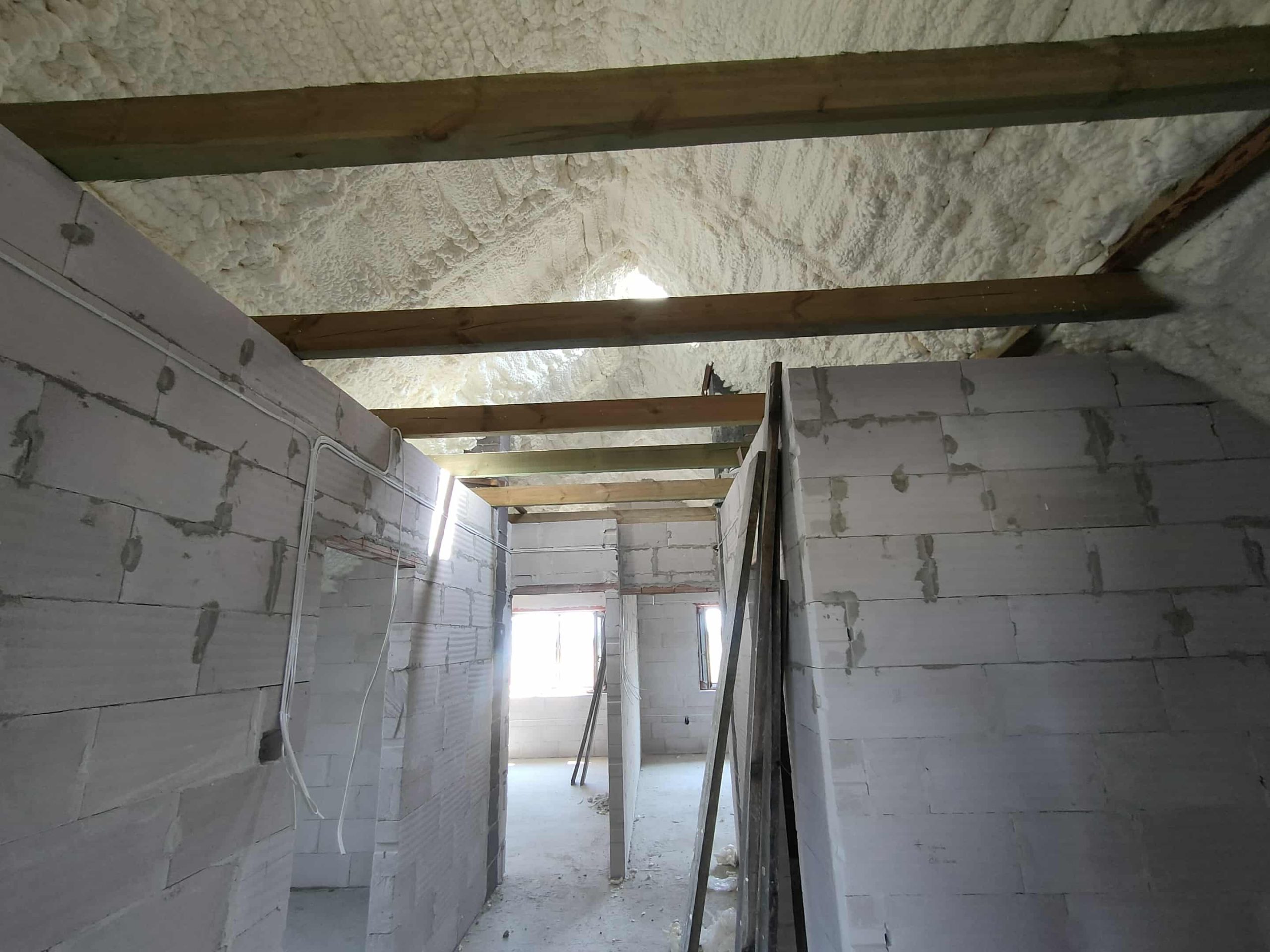 Przy tej realizacji konieczne było precyzyjne uszczelnienie konstrukcji drewnianej, elementów murowanych oraz miejsc wokół okien dachowych. Piana PUR idealnie dopasowała się do kształtu połaci, dokładnie wypełniając przestrzenie przy krokwiach i stykach ścian. Dzięki temu izolacja jest szczelna i pozbawiona mostków termicznych, co znacząco wpływa na utrzymanie komfortu cieplnego w przyszłych pomieszczeniach użytkowych.