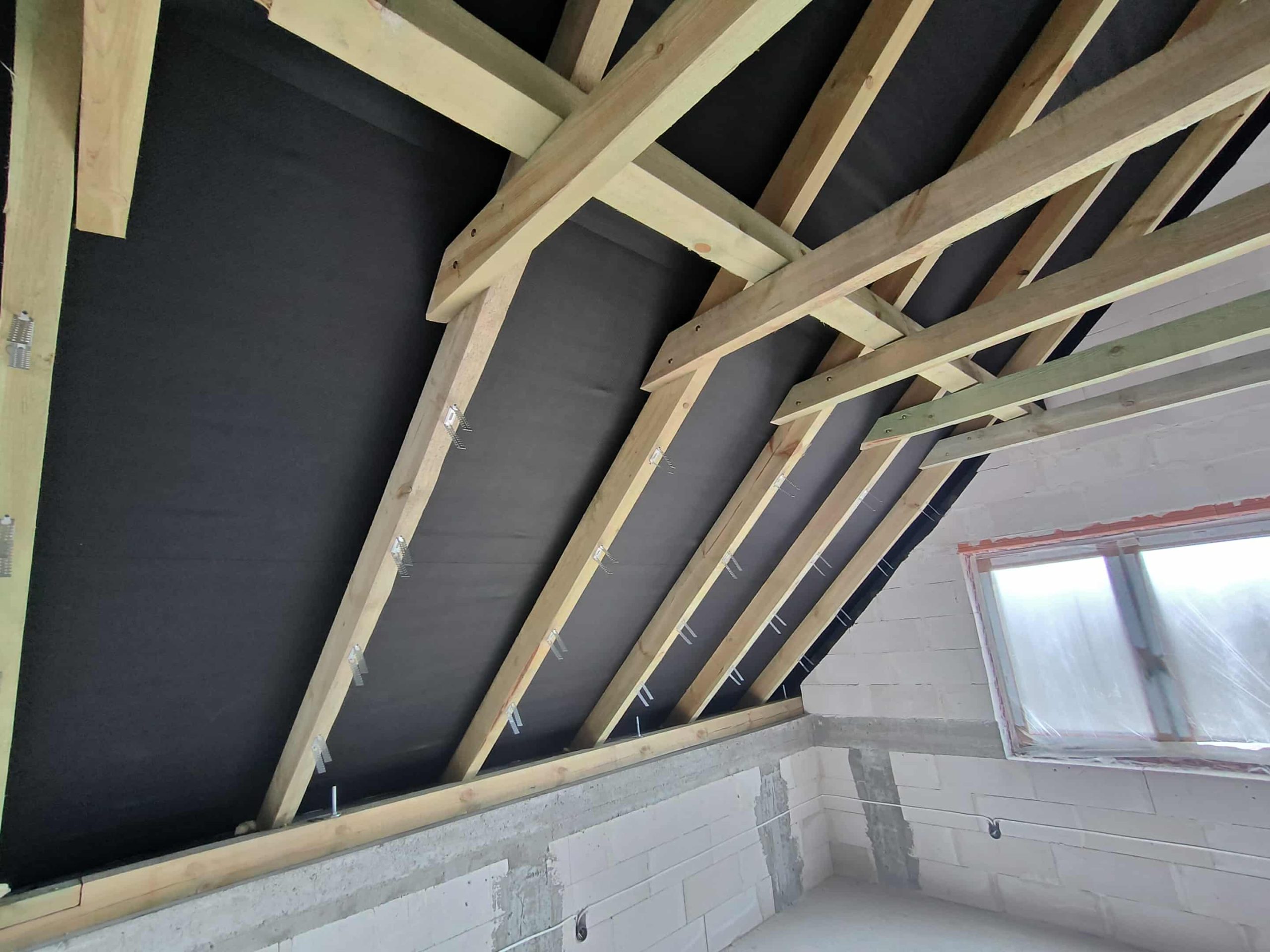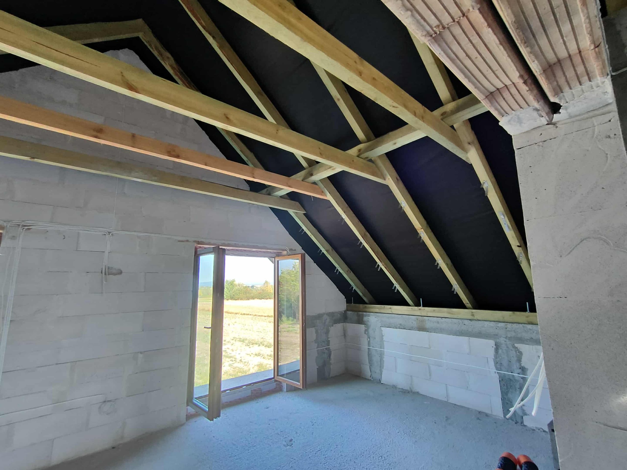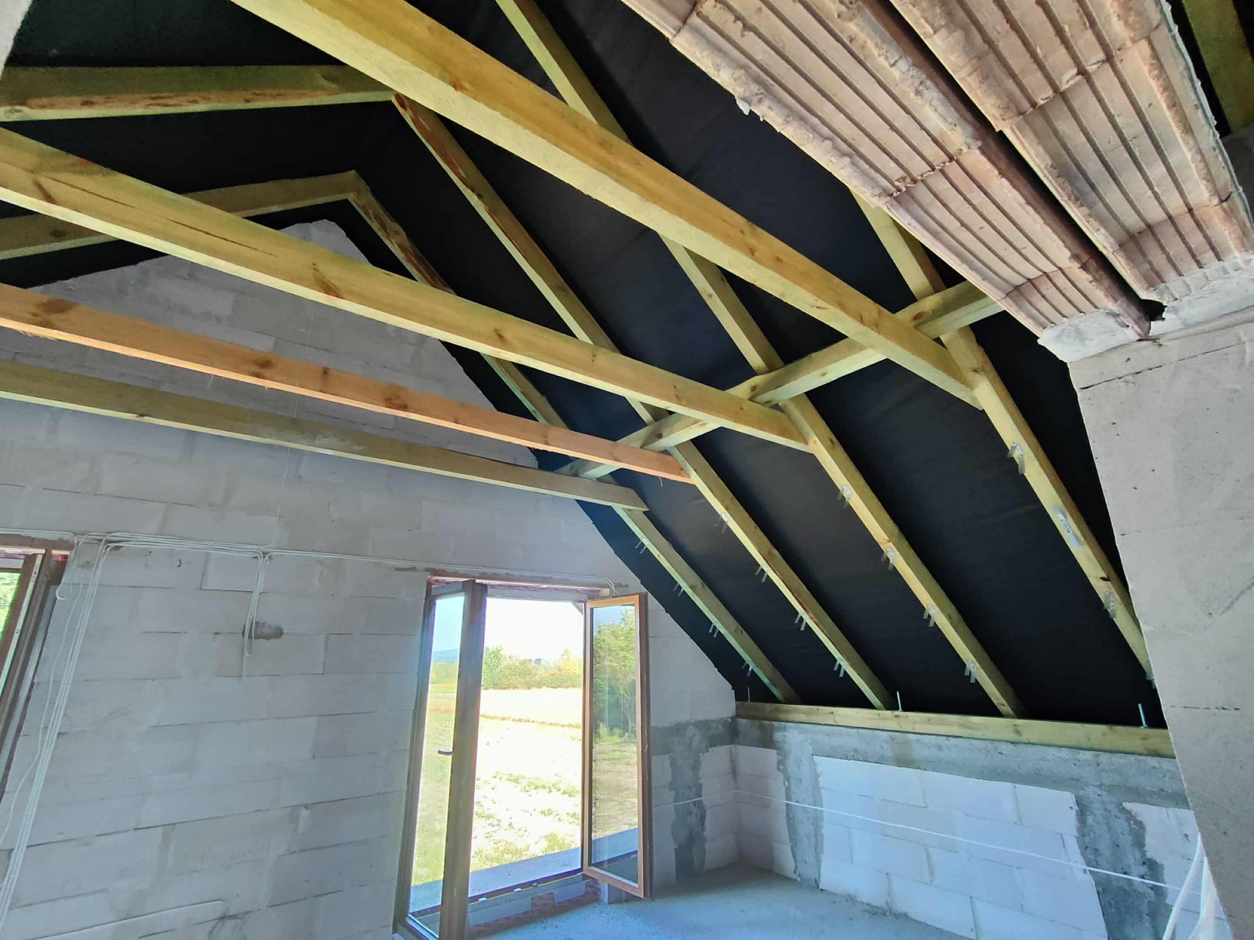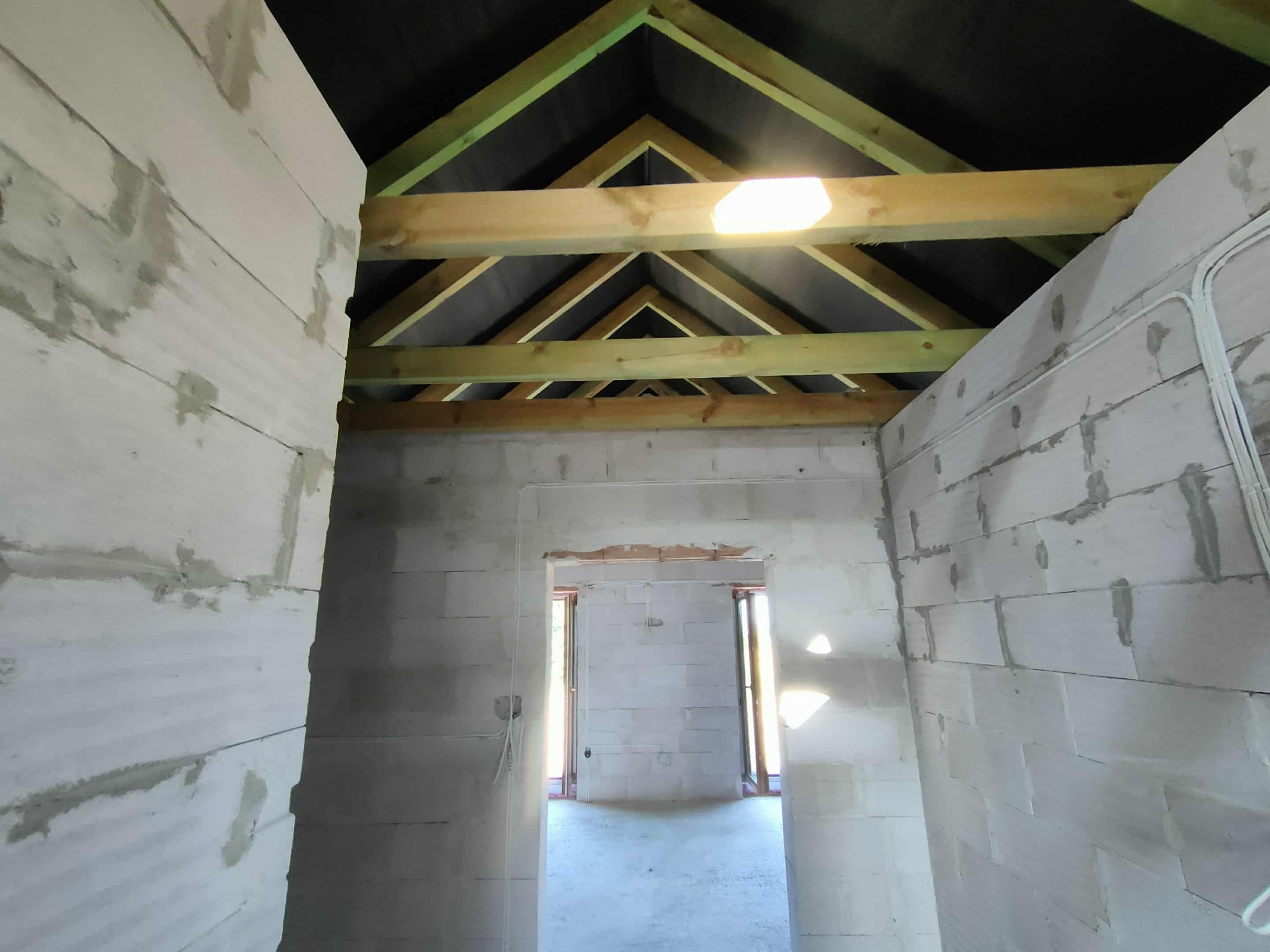 Przy tej realizacji konieczne było precyzyjne uszczelnienie konstrukcji drewnianej, elementów murowanych oraz miejsc wokół okien dachowych. Piana PUR idealnie dopasowała się do kształtu połaci, dokładnie wypełniając przestrzenie przy krokwiach i stykach ścian. Dzięki temu izolacja jest szczelna i pozbawiona mostków termicznych, co znacząco wpływa na utrzymanie komfortu cieplnego w przyszłych pomieszczeniach użytkowych.