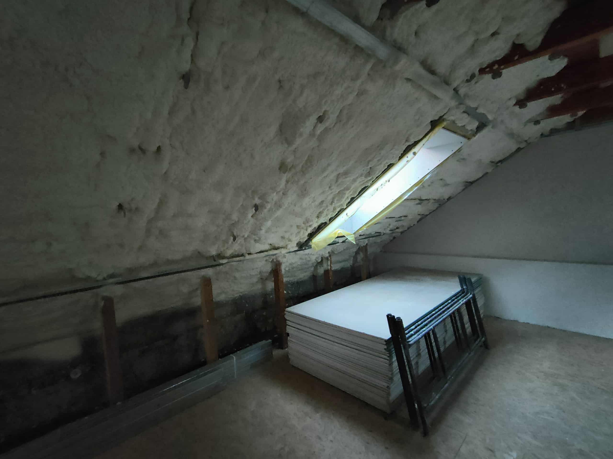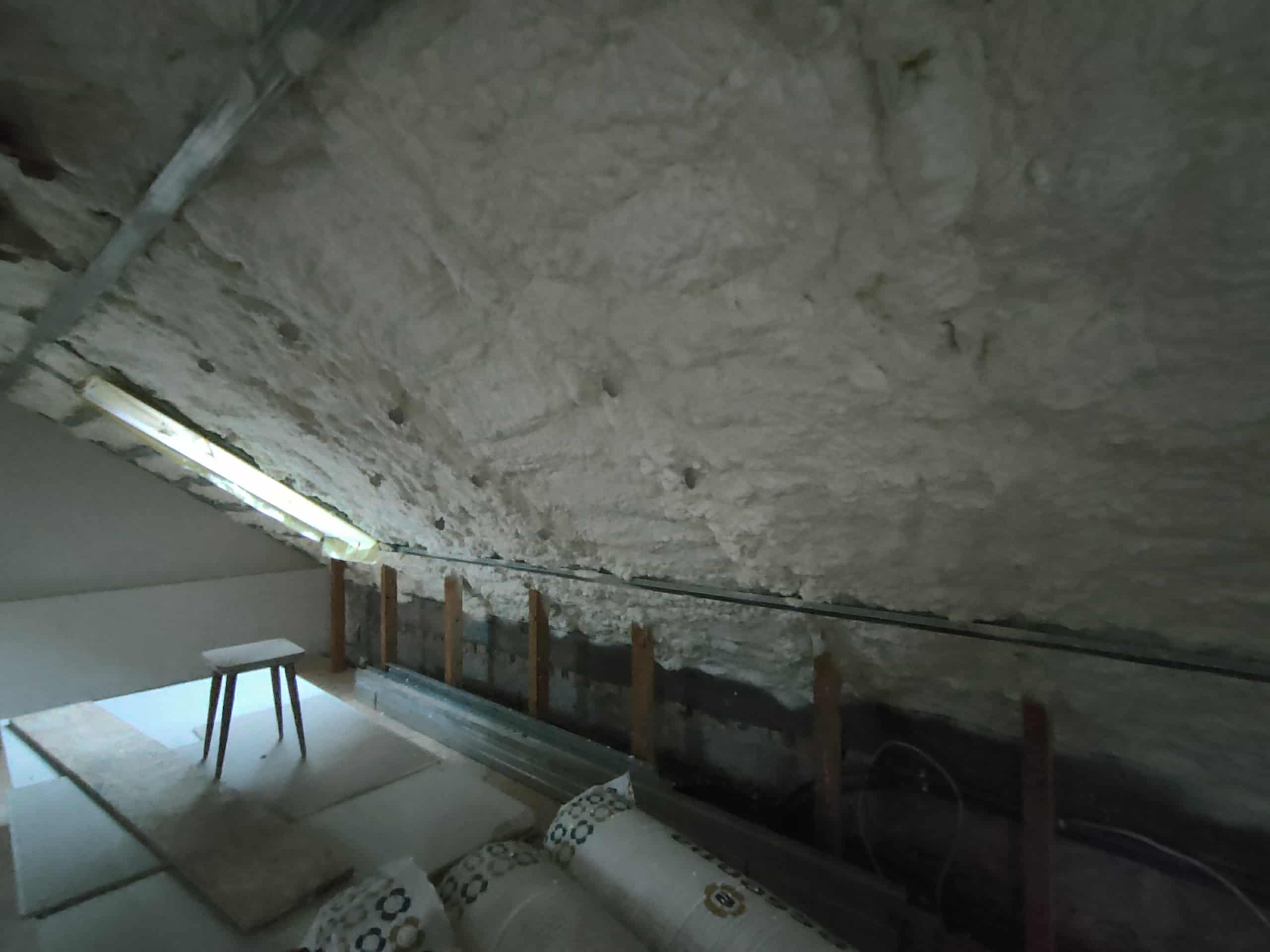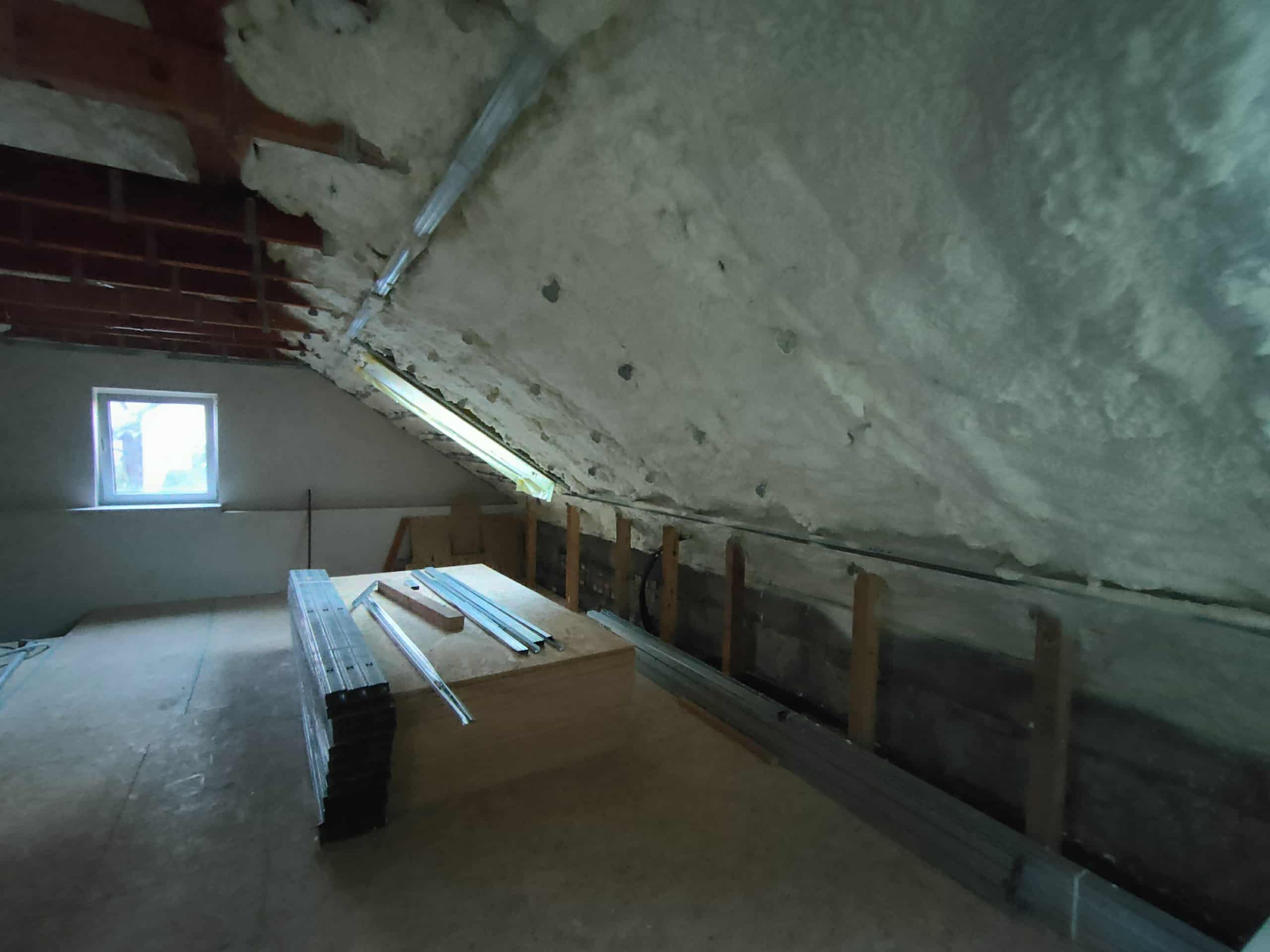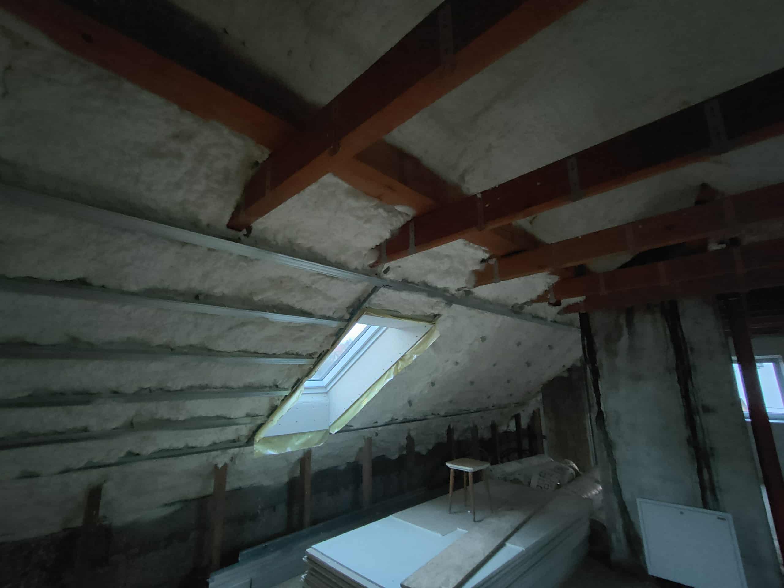 Poddasze posiadało solidną, lecz miejscami nieszczelną konstrukcję z elementami drewnianymi i murowanymi. Widoczne były chłonne, nierówne powierzchnie oraz miejsca, w których dotychczasowe ocieplenie (lub jego brak) nie zapewniało szczelnej ochrony przed chłodem. Skosy dachowe oraz przestrzenie przy oknach dachowych wymagały precyzyjnego uzupełnienia izolacji, aby wyeliminować powstawanie mostków termicznych. Dodatkowym wyzwaniem były przegrody o zróżnicowanych wysokościach oraz belki konstrukcyjne, które należało dokładnie obrobić materiałem natryskowym.